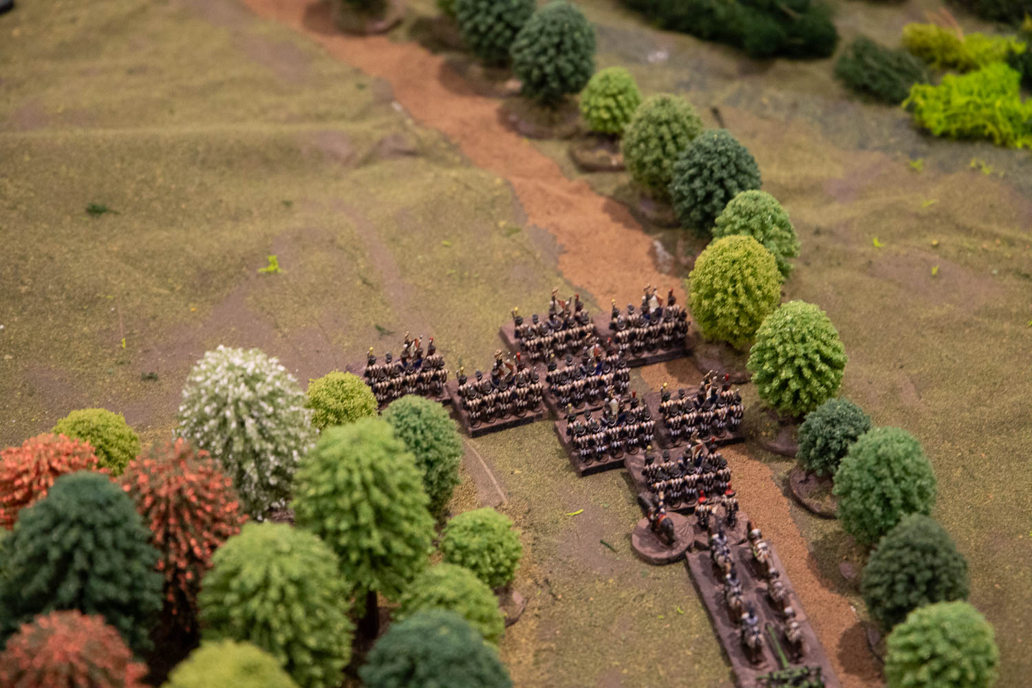 Dokhturov began the game by seeking to concentrate about a half mile forward of his crossing point but while his cossack brigade complied promptly, there were delays getting his right wing moving. Ultimately the timing of this helped him, allowing the Russians to counter the French directly.