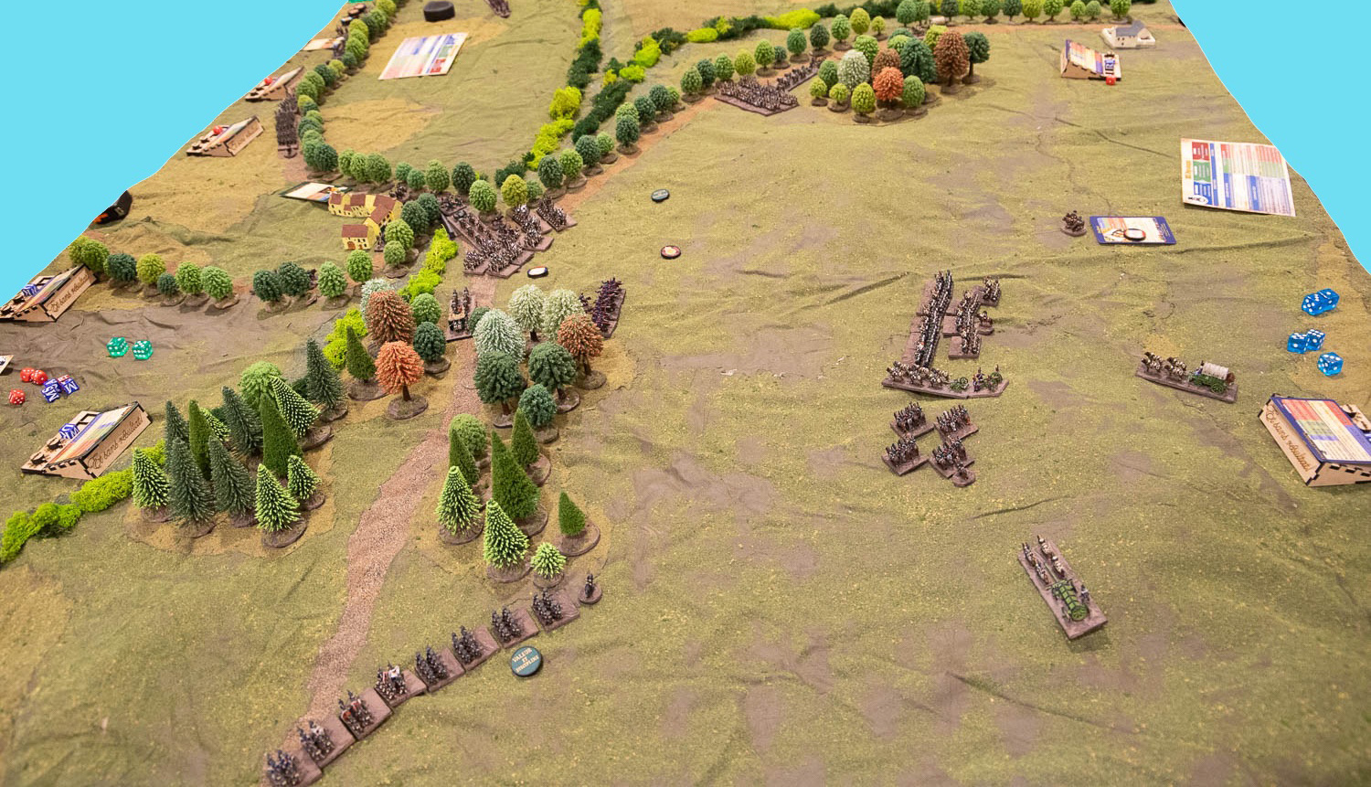 In the first intro game of AdeptiCon 2024, Oudinot attempts to push back Dokhturov as the Russian general tries to cross a small river and unite his separated command. The initial setup placed the French in a slightly better position, as while Oudinot’s corps d’armée was also dispersed, it was arranged parallel to the Russians and without any intervening obstacle.
