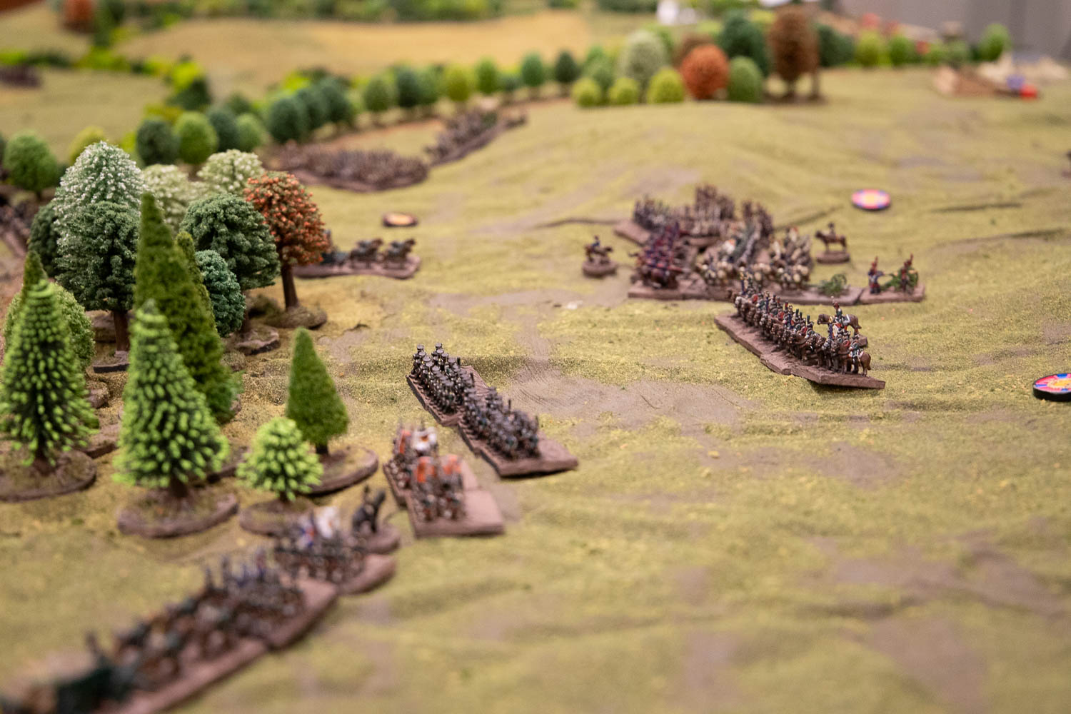 In the first intro game of AdeptiCon 2024, Oudinot attempts to push back Dokhturov as the Russian general tries to cross a small river and unite his separated command. The initial setup placed the French in a slightly better position, as while Oudinot’s corps d’armée was also dispersed, it was arranged parallel to the Russians and without any intervening obstacle.