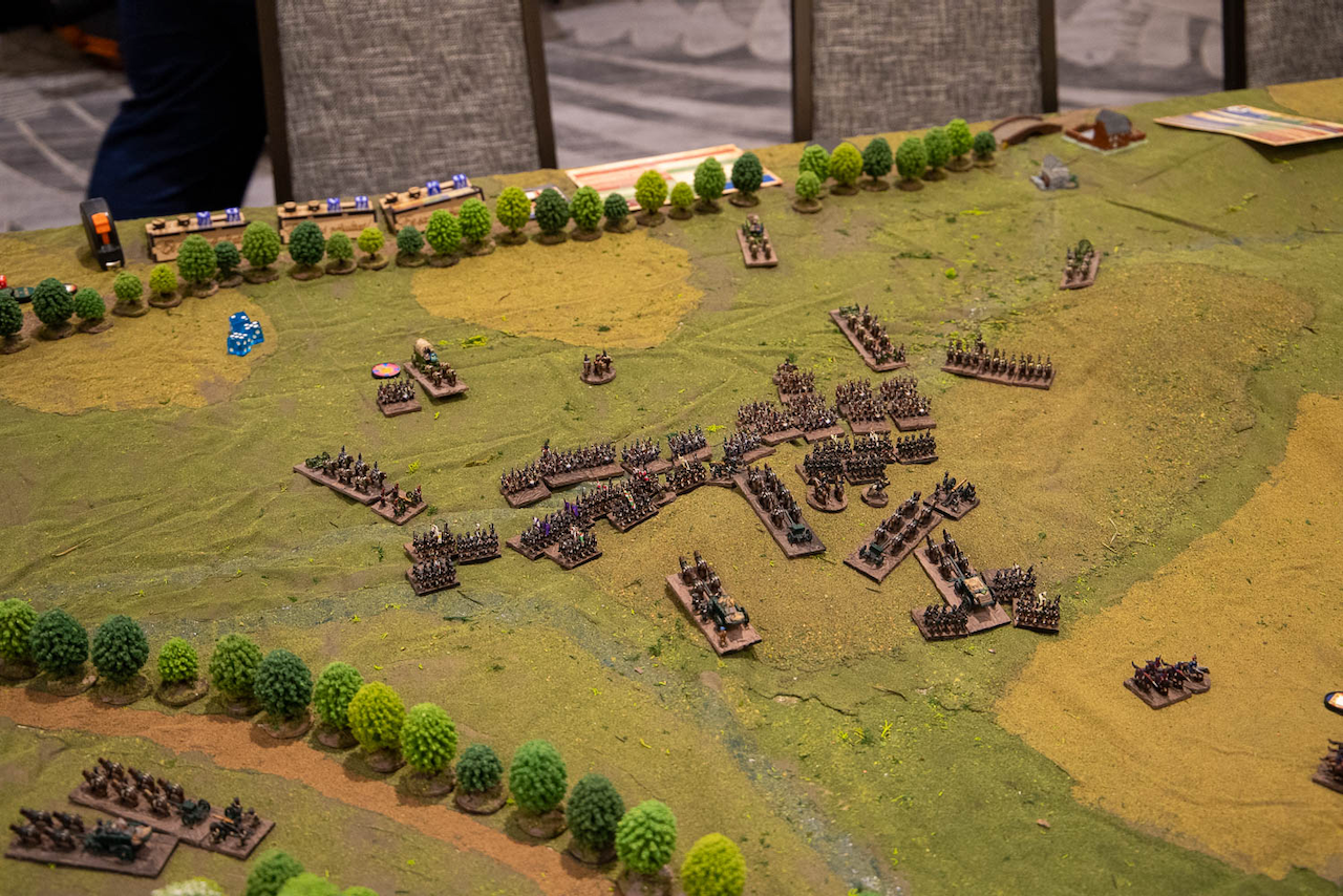 Despite not beginning his deployment until later than the French, Dokhturov’s columns manage to deploy rapidly and the Russians appear to have an initial advantage over Oudinot. On the other end of the field Eugene is closely monitoring his own deployments successfully staging his two divisions one behind the other with his lead division covering the deployment of his second. Opposite him, Bennigsen is struggling to concentrate each of his divisions as they face a much more prepared host.